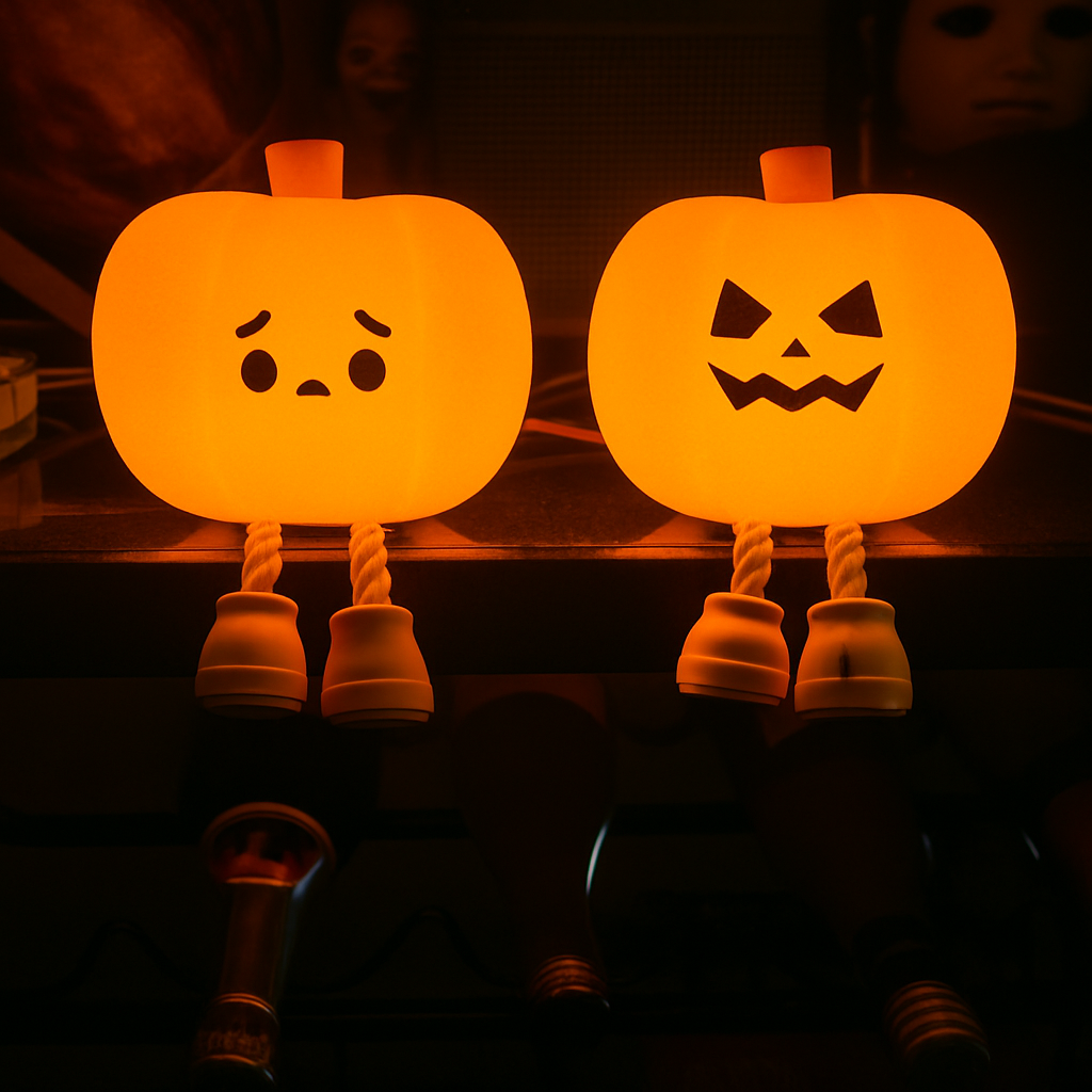 On the left, Cozy Pumpkin™ brings warmth, comfort, and a soft glow — perfect for cozy nights or dorm rooms.